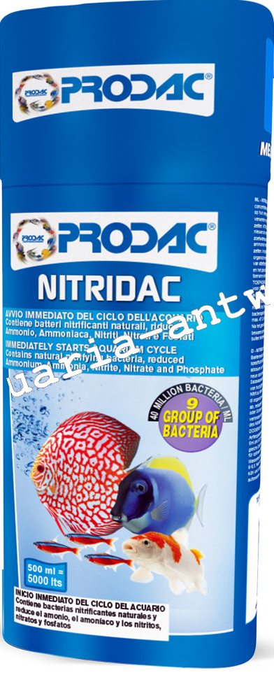 A liquid high concentrate of bacteria carefully selected for their capacity in breaking down organic matter and for transforming ammonia in aquariums. This product can be used in new or existing fresh and saltwater aquariums to transform highly toxic ammonia into nitrites and nitrites into nitrates. NITRIDAC actually causes the rapid degeneration of organic compounds reducing the build up of sediment or mud, restores aquarium walls and beds preventing the formation and growth of algae and also prevents an increase in nitrites.